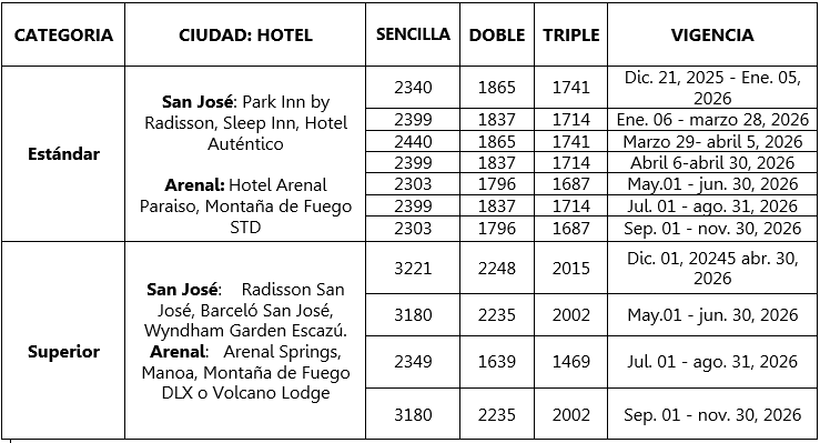 • Evento de fin de año en el caso del paquete en superior para el área de Arenal (Hotel Arenal Manoa o Arenal Springs), precio por persona adulta $385.00 y niños $195.00